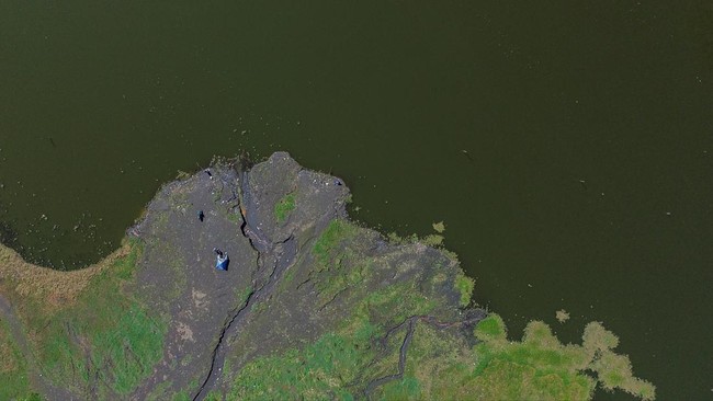 Foto udara kondisi danau Ranu Pani menyusut menjadi 3,4 hektare dari sebelumnya 5,9 hektare di Kawasan Taman Nasional Bromo Tengger Semeru (TNBTS), Lumajang, Jawa Timur, Kamis (7/8/2025). ANTARA FOTO/Irfan Sumanjaya
