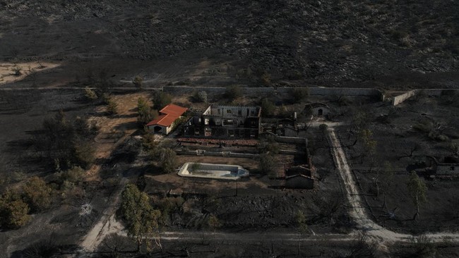 Foto udara menunjukkan lahan hangus akibat kebakaran hutan di Keratea, dekat Athena, Yunani, Sabtu (9/8/2025). REUTERS/Stelios Misinas