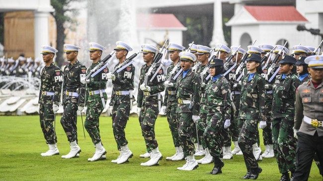 Jakarta - Istana menggelar gladi kotor atau jelang HUT ke-80 RI. Sejumlah pasukan, mulai Paskibraka hingga pasukan TNI-Polri, melakukan latihan di lapangan Istana.