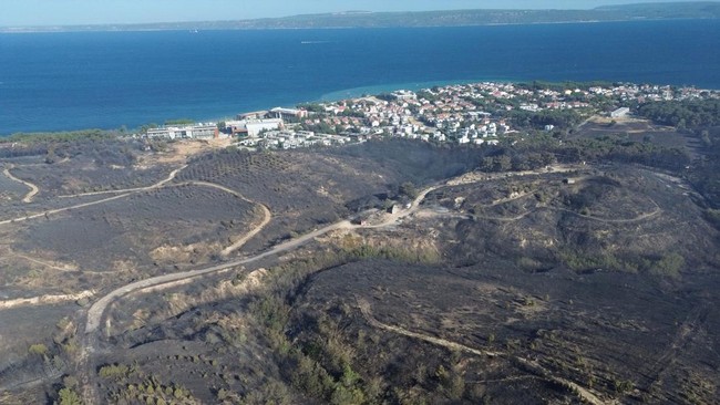 Turki - Dampak kebakaran hutan terlihat jelas di Erenkoy, Canakkale, Turki. Foto udara menunjukkan lahan hangus dan kerusakan parah di kawasan barat laut Turki.