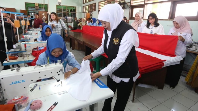 Surabaya - Gubernur Jawa Timur Khofifah Indar Parawansa ikut menjahit Bendera Merah Putih di ruang praktik busana SMK Negeri 8 Surabaya.