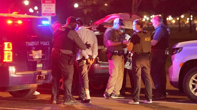 Petugas polisi memeriksa barang-barang milik seseorang yang ditahan karena masalah SIM, setelah pengumuman Presiden AS Donald Trump tentang pengambilalihan Departemen Kepolisian Metropolitan oleh pemerintah federal di bawah Undang-Undang Home Rule dan pengerahan Garda Nasional untuk membantu pencegahan kejahatan di ibu kota negara, dekat Gedung Putih, di Washington, D.C., AS, Rabu (13/8/2025). REUTERS/Ken Cedeno