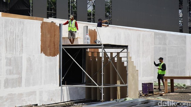 Jakarta - Pekerja merampungkan panggung pesta rakyat HUT ke-80 RI di Monas. Acara meriah ini hadirkan musik, kuliner gratis, hingga kembang api spektakuler.