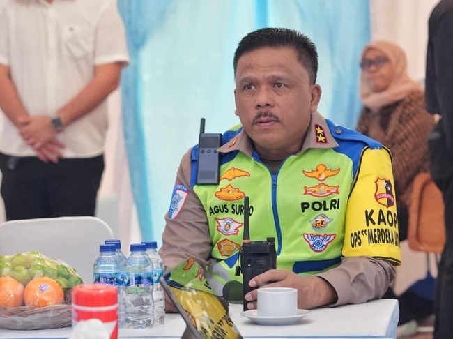 Jakarta - Kakorlantas Polri Irjen Agus Suryonugroho memantau pengamanan lalu lintas pada puncak HUT ke-80 RI di Jakarta. Ia memantau pengamanan dengan naik sepeda motor.
