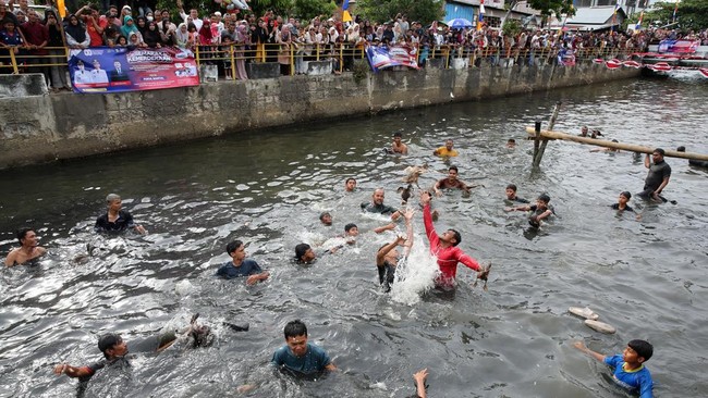 Aceh - Warga Banda Aceh heboh mengikuti lomba tangkap bebek di Sungai Lampaseh. Tradisi lucu ini meriahkan HUT ke-80 Kemerdekaan RI.