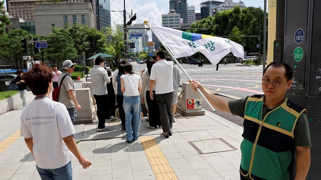 Pemerintah Korea Selatan menggelar National Civil Defense Drill di pusat Kota Seoul pada Rabu (20/8/2025). Ribuan warga berpartisipasi dalam simulasi ini sebagai langkah kesiapsiagaan menghadapi kemungkinan serangan udara. REUTERS/Soo-hyeon Kim