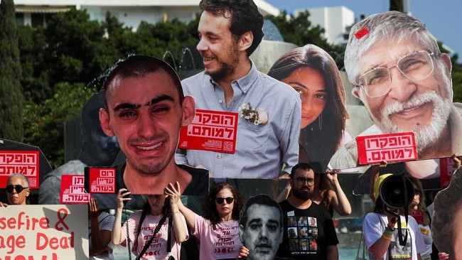 Tel Aviv - Warga Israel turun ke jalan menuntut pembebasan sandera. Aksi juga menyerukan hentinya perang usai serangan Hamas 7 Oktober 2023.