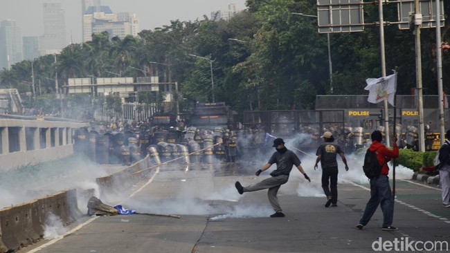 Jakarta - Massa pelajar terlibat bentrok dengan aparat saat unjuk rasa di DPR, Jakarta. Polisi gunakan gas air mata dan water canon untuk bubarkan aksi.