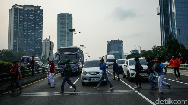 Jakarta - Massa aksi menutup ruas Tol Dalam Kota di Flyover Pejompongan, Jakarta, Senin (25/8/2025). Bentrokan dengan polisi memicu kericuhan dan perusakan kendaraan.