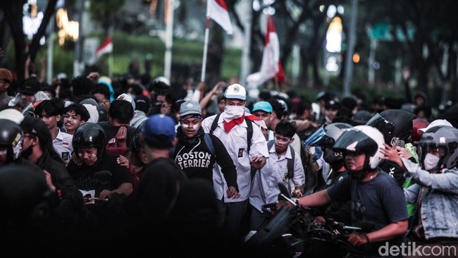 Jakarta - Massa yang hendak demo menuju DPR diadang polisi di Jalan Gerbang Pemuda, Jakarta. Massa berlarian saat dipukul mundur polisi.