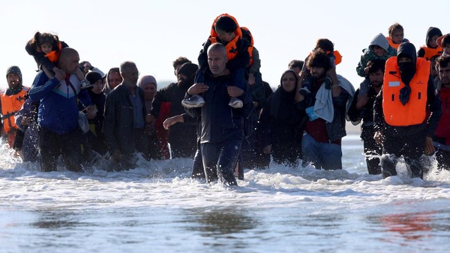 Prancis - Puluhan migran berusaha menyeberangi Selat Inggris dari pantai Calais, Prancis. Sebagian berhasil berangkat, namun perempuan dan anak-anak tertinggal di darat.