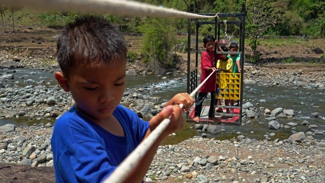 Sejumlah anak menyeberangi Sungai Tompobulu menggunakan gondola ke Dusun Makmur, Desa Bonto Manurung, Kabupaten Maros, Sulawesi Selatan, Selasa (26/8/2025). ANTARA FOTO/HASRUL SAID