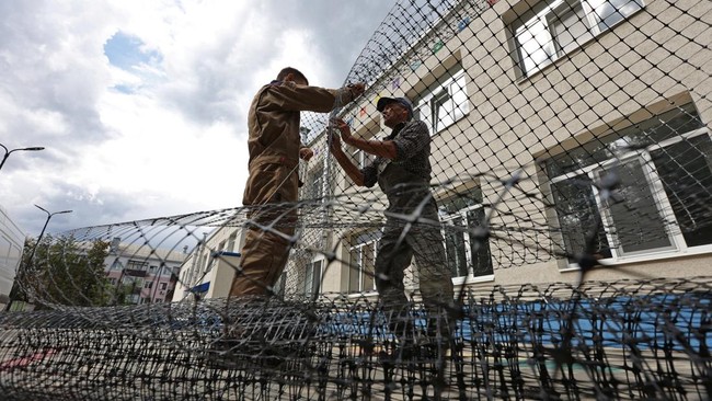 Pekerja memasang jaring anti-drone di Taman Kanak-kanak "Vitaminka" Belgorod untuk melindungi anak-anak dari ancaman serangan UAV. Foto: REUTERS/Anton Vergun