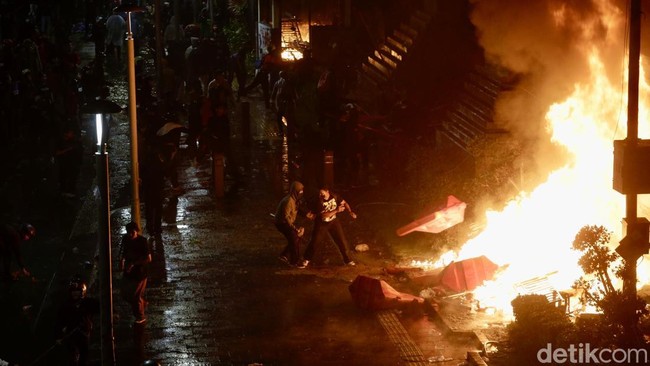 Jakarta - Demonstrasi di Polda Metro Jaya malam ini masih memanas. Polisi meminta para pendemo untuk berhenti anarkis dan pulang.