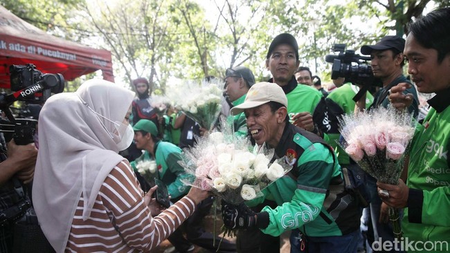 Jakarta - Ratusan driver ojol menggelar aksi damai dengan membagikan bunga di kawasan Monas. Aksi ini jadi simbol persatuan dan ajakan menjaga kondusifitas.