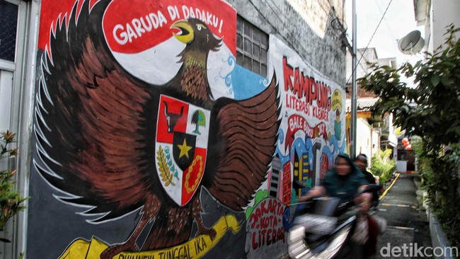 Jakarta - Lorong sempit Jakarta dipenuhi mural warna-warni sarat kritik sosial dan pesan kebangsaan. Dari anti narkoba hingga toleransi, semua tergambar di dinding kota.