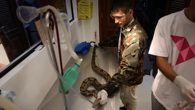 Petugas LSM Instituto Vida Livre merawat ular yang diselamatkan dari lingkungan perkotaan di Rio de Janeiro. Foto: REUTERS/Pilar Olivares