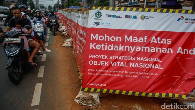 Jakarta - Proyek galian di Jalan Dr Saharjo, Setiabudi, Jakarta, membuat jalan menyempit. Aktivitas alat berat dan revitalisasi trotoar menambah kepadatan lalu lintas.