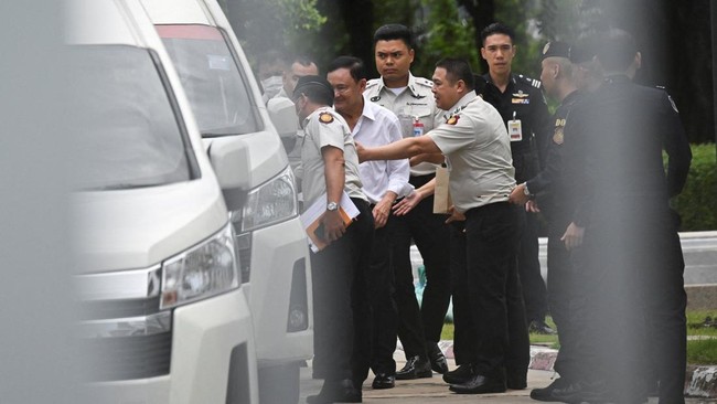 Mantan Perdana Menteri Thailand Thaksin Shinawatra dikawal oleh petugas pemasyarakatan setelah Mahkamah Agung memutuskan untuk mengembalikan Thaksin ke penjara selama satu tahun, dalam kasus masa inap enam bulan yang melanggar hukum sebelum ia mendapatkan pembebasan bersyarat, di Bangkok, Thailand, pada Selasa (9/9). Foto: REUTERS/Panumas Sanguanwong