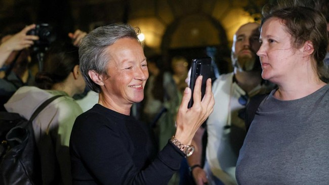 Seorang tahanan yang dibebaskan dari Belarus, jurnalis Irina Slavnikova, berbicara di telepon saat ia dan tahanan lain yang dibebaskan tiba di kedutaan AS di Vilnius, Lituania, Kamis (11/9/2025). REUTERS/Kacper Pempel