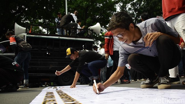 Jakarta - Ratusan peserta Gerakan Rakyat untuk Damai gelar aksi di Jakarta. Massa membubuhkan tanda tangan petisi dan deklarasi damai demi persatuan bangsa.
