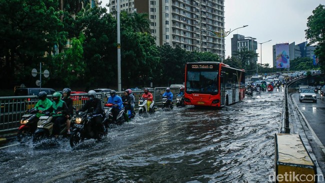 Jakarta - Hujan deras menyebabkan genangan di Jalan Raya Casablanca setinggi 20 cm. Kondisi ini membuat arus lalu lintas tersendat dan sejumlah motor mogok.