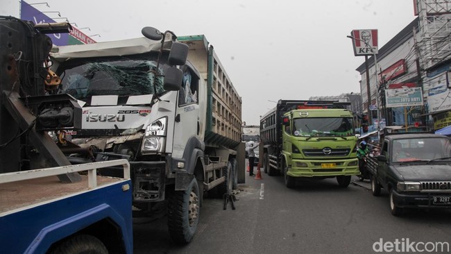 Tangerang Selatan - Sebuah truk alami kecelakaan di Jalan Dewi Sartika, Ciputat, Tangerang Selatan. Kendaraan rusak parah itu diderek petugas untuk mengurai kemacetan lalu lintas.