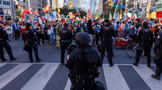 Polisi memblokir akses ke University Avenue saat para demonstran berbaris untuk memprotes kebijakan di bawah pemerintahan Perdana Menteri Mark Carney termasuk kebijakan tentang iklim, pemotongan layanan publik, peningkatan anggaran militer dan dukungan terhadap Palestina, di Toronto, Ontario, Kanada, Sabtu (20/9/2025). REUTERS/Carlos Osorio