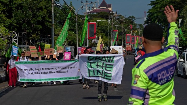 Makassar - Sejumlah aktivis lingkungan bersama warga pesisir menggelar aksi Draw The Line di Kota Makassar, Sulawesi Selatan.