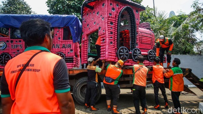 Petugas dari UPS Badan Air DLH Jakarta menurunkan kapal berbentuk kereta di Bantaran Kali Ciliwung, Jakarta, Selasa (23/9/2025).