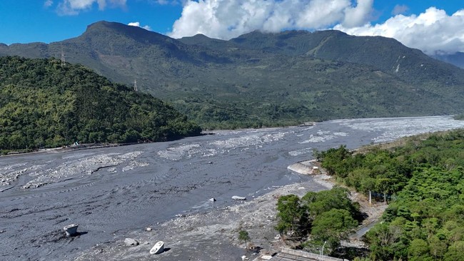 Foto udara memperlihatkan jembatan ambruk dan wilayah tergenang banjir usai Topan Ragasa di Hualien, Taiwan, Kamis (25/9/2025). Bencana tersebut memutus akses transportasi dan menyulitkan distribusi bantuan ke daerah terdampak. REUTERS/Ann Wang
