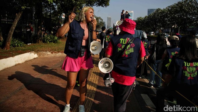 Jakarta - Sejumlah warga turun ke jalan dalam Women's March Jakarta 2025. Poster kritis tentang pendidikan, kesehatan, hingga kesetaraan gender jadi sorotan utama aksi.