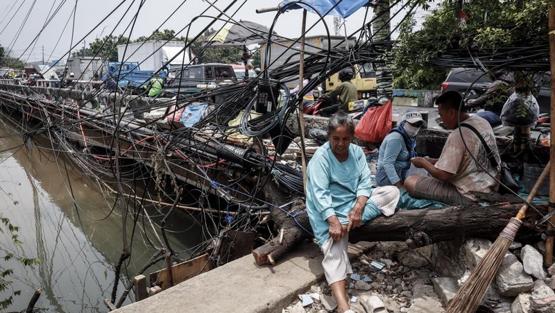 Warga duduk di dekat tumpukan kabel semrawut di Jalan Raya Kapuk, Jakarta, Selasa (30/9/2025). ANTARAFOTO/Muhammad Rizky Febriansyah