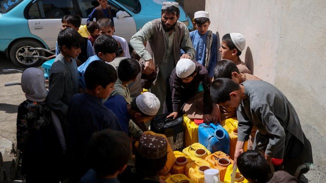 Kabul - Air bersih jadi barang mewah di Kabul, Afghanistan. Warga harus menempuh jarak ratusan meter dan antre berjam-jam demi memenuhi kebutuhan sehari-hari.