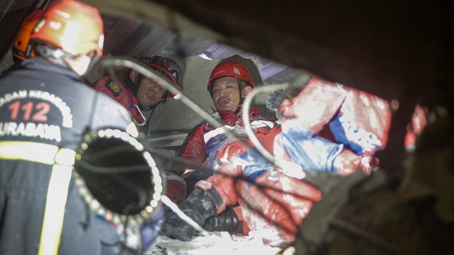Tim SAR gabungan mencari korban bangunan mushalla yang ambruk di Pondok Pesantren (Ponpes) Al Khoziny di Kecamatan Buduran, Sidoarjo, Jawa Timur, Senin (29/9/2025) malam. Sejumlah santri terluka dan beberapa santri diduga masih terjebak di dalam reruntuhan bangunan. ANTARA FOTO/Umarul Faruq