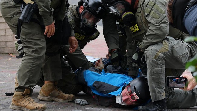 Aksi yang diikuti puluhan demonstran tersebut berujung bentrokan dengan aparat penegak hukum setelah massa menolak untuk membubarkan diri, pada Sabtu (4/10/2025). REUTERS/Carlos Barria