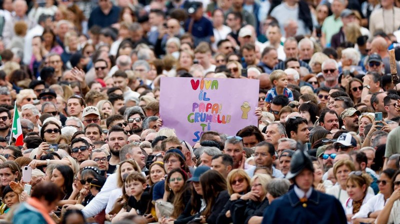 Ribuan umat beriman dari berbagai negara hadir untuk mengikuti perayaan rohani, di Lapangan Santo Petrus, Vatikan, Minggu (5/10/2025). REUTERS/Remo Casilli