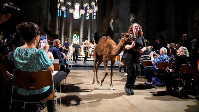 Seorang pemandu berjalan bersama unta dalam prosesi hewan di Katedral St. John the Divine, Manhattan, New York, Minggu (5/10/2025). Tradisi ini menjadi bagian dari perayaan Feast of Saint Francis dan Blessing of the Animals. REUTERS/Eduardo Munoz