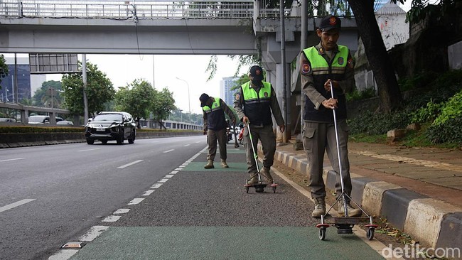 Jakarta - Petugas Satuan Polisi Pamong Praja (Satpol PP) melakukan giat rutin menjaring ranjau paku di sepanjang Jalan Gatot Subroto, Jakarta.