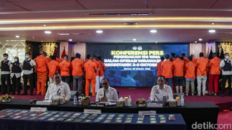 Sebanyak 30 tahanan WNA yang bermasalah dengan keimigrasian diperlihatkan dalam konferensi pers. Operasi Wira Waspada di Jabodetabek berlangsung pada 3-5 Oktober 2025.