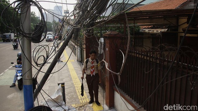 Jakarta - Kabel fiber menjuntai dan tiang miring tampak di Jalan Abdullah Syafei, Tebet, Jakarta Selatan. Tiang yang nyaris roboh ini membahayakan pengguna jalan.