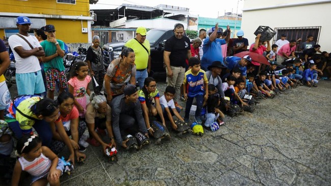 Warga berkerumun menyaksikan puluhan kura-kura lukis siap berlomba di depan Gereja San Francisco de Asis, Aragua, Venezuela. Foto: REUTERS/Juan Carlos Hernandez