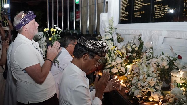 Bali - Warga lokal dan wisatawan asing bersatu dalam doa memperingati 23 tahun Tragedi Bom Bali. Upacara digelar di Monumen Kemanusiaan, mengenang 202 korban jiwa.
