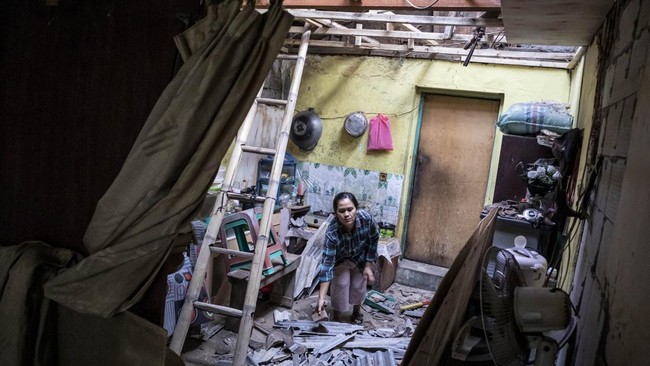 Warga membersihkan puing atap rumahnya yang ambruk terdampak bencana puting beliung di Padasuka, Kota Cimahi, Jawa Barat, Senin (13/10/2025). Foto: ANTARA FOTO/Abdan Syakura