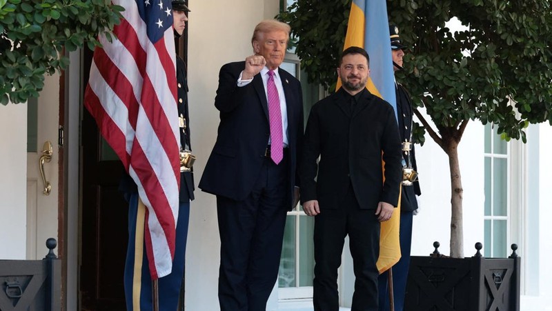 Presiden Amerika Serikat Donald Trump menyambut Presiden Ukraina Volodymyr Zelensky di Gedung Putih, Washington, D.C., 17 Oktober 2025. Kedua pemimpin bertemu untuk membahas keamanan bilateral, perang Rusia-Ukraina yang masih berlangsung, serta upaya menuju gencatan senjata. Foto: REUTERS/Jonathan Ernst