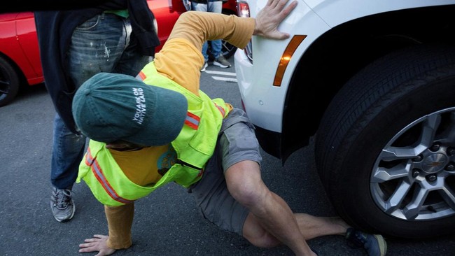 Dalam kericuhan itu, seorang pengunjuk rasa mengalami luka setelah kakinya terjepit roda mobil. Sejumlah demonstran dan aparat kepolisian terlibat saling dorong di tengah kerumunan massa yang memadati area sekitar pangkalan Penjaga Pantai Alameda, California, pada Kamis (23/10/2025). REUTERS/Manuel Orbegozo