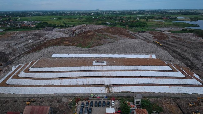 Foto udara memperlihatkan tumpukan sampah yang telah dilapisi tanah dan geotekstil di TPA Jatiwaringin, Kabupaten Tangerang, Banten, Jumat (24/10/2025). ANTARA FOTO/Putra M. Akbar