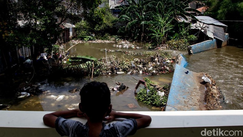 Air dari anak sungai mengalir deras ke kawasan permukiman warga.