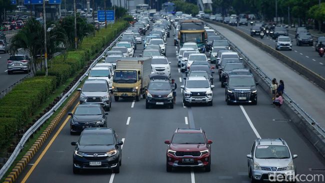 Jakarta - Arus kendaraan tersendat cukup panjang akibat sebuah mobil yang mengalami kendala dan mengganti ban di tengah lajur Tol Dalam Kota (Dalkot) Jakarta.