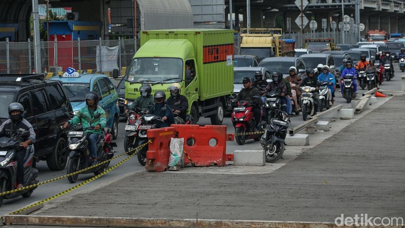 Jalan yang semula lebar kini menyempit karena sebagian ruas digunakan untuk pengerjaan proyek, membuat lalu lintas tersendat.